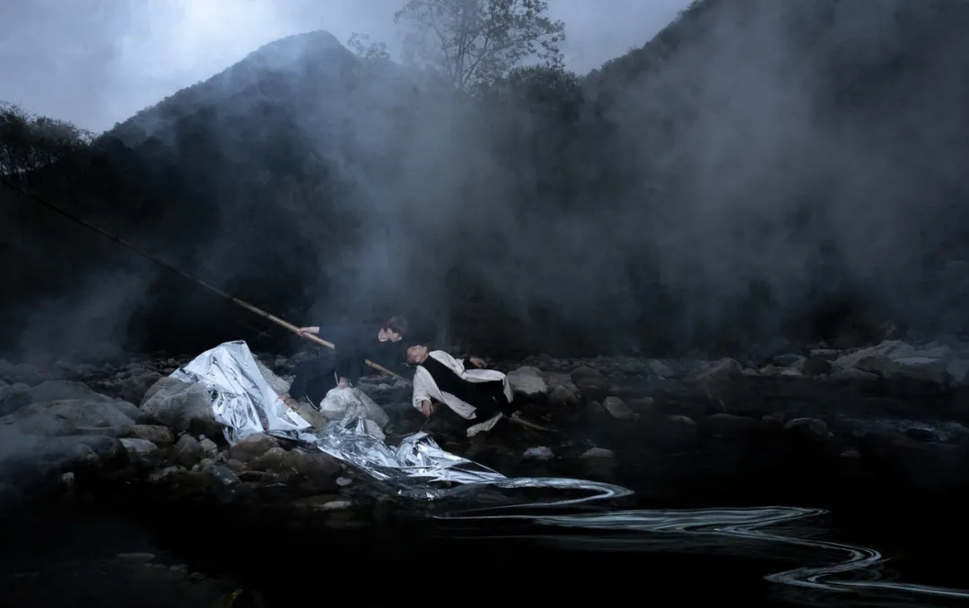 舞美视觉取水的意象,参考中国绘画中最初用于画水的勾水法,用线描绘水的形状、形态最终取其线感,用线性结构形成装置,构筑河流、两个世界、三个视角。