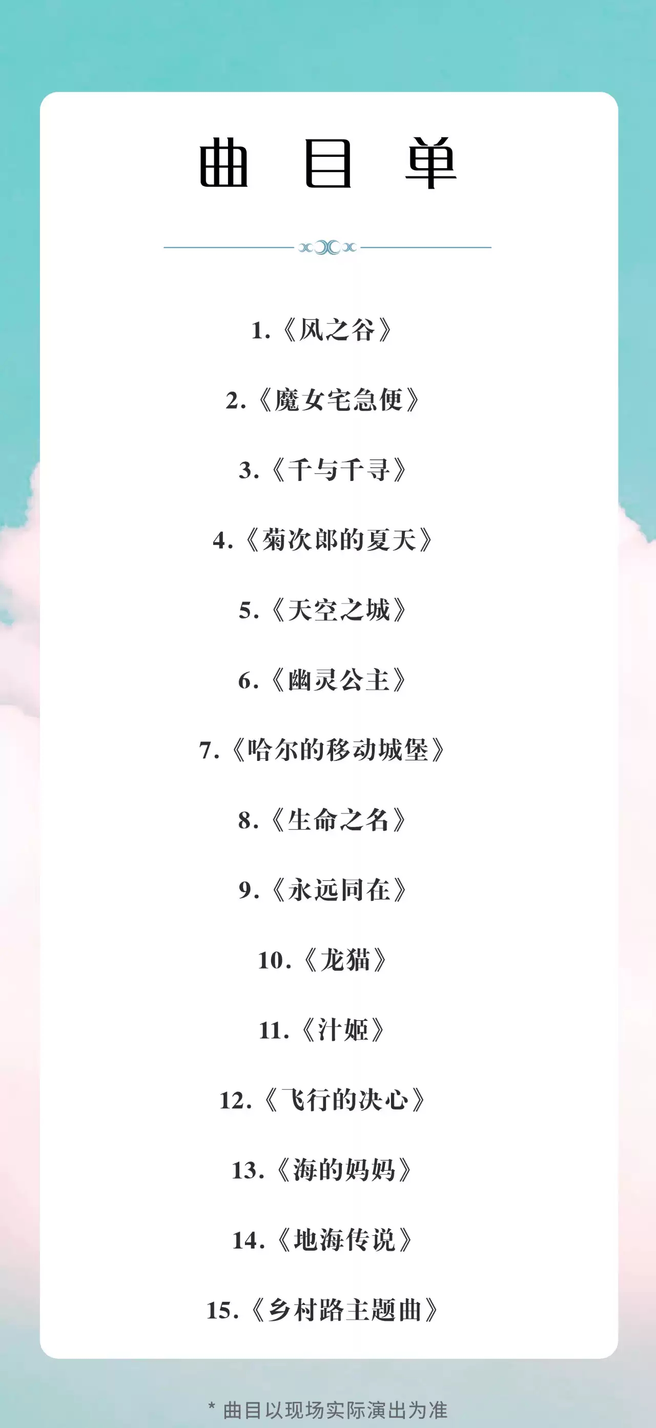 在本场音乐会中,我们将伴随着精彩熟悉的电影画面,聆听温暖浪漫的旋律,这样巧妙的视听设计,给演出现场带来无与伦比的冲击效果,让观众朋友们享受美丽的视听盛宴。《天空之城》、《千与千寻》、《龙猫》、《哈尔的移动城堡》、《魔女宅急便》等大家熟悉的动漫音乐,将在此次音乐会中再现,让我们一起期待。