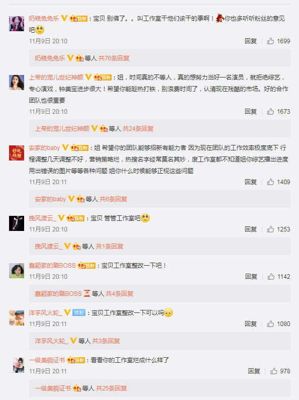 从粉丝们的留言来看,大部分是吐槽工作室不作为,工作效率低,不经常发行程图,还接了太多综艺。这让一直希望证明自己演技的偶像,离粉丝们的期望越来越远。