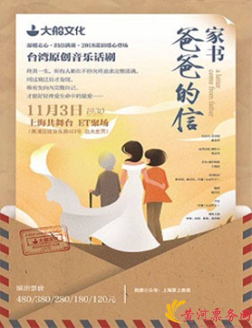 2018台湾原创音乐剧《家书-爸爸的信》-上海站即将于11月3日在上海ET聚场(上海共舞台)拉开帷幕,你做好准备了吗?可以说这场音乐剧的情节非常鲜明,剧情也非常的清晰,表达的意思也非常的明显,你想不想来看看到底是怎样演绎的呢?那就来吧,2018台湾原创音乐剧《家书-爸爸的信》-上海站让我们不见不散吧!