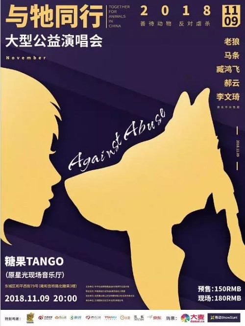 由中华社会救助基金会&与牠同行公益计划主办的“2018与牠同行大型公益演唱会”,将于2018年11月9日在糖果TANGO-雍和宫店三层举行。主办方提出“用我们的音乐,让牠们有家可归”的口号,希望人们共同反对虐待动物,关爱生命尊严。
