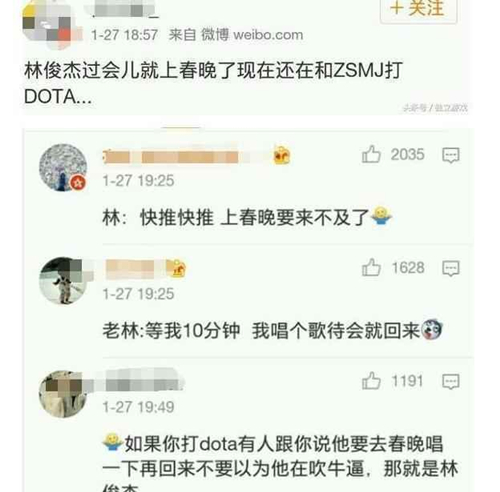 不过林俊杰可不只是会唱歌,还是一个游戏高手沉迷玩游戏,主玩《dota2》而且据说在林俊杰要去春晚唱歌的时候还在后边完了一把游戏,真的是彻彻底底的游戏迷,因为这件事,还让网友有了吐槽对象,纷纷在林俊杰的微博留言。