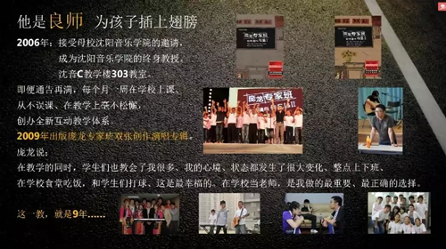 可以说在获得名利之后,对于所有的歌手来讲,都会是一条复杂的分岔口,犹如一线城市环线和立交的交通枢纽,何去何从、千差万别。而庞龙选择的却是一条最音乐的路,那就是在洗尽铅华之后,庞龙选择接收母校的邀请,成为沈阳音乐学院的终身教授,为更多的孩子插上音乐梦想的翅膀,将自己的经验、自己的经历、自己技巧教给更多的孩子们!