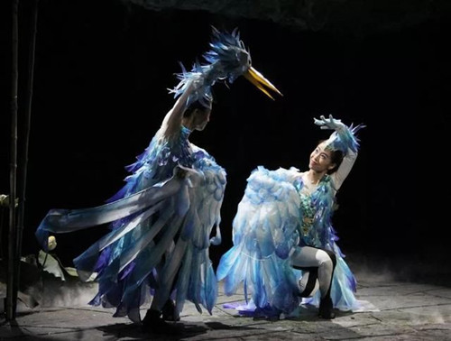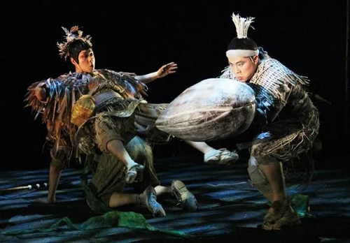 2.肢体剧新呈现:意会不需言传’是没有台词的《鹬·蚌·鱼》的创作理念,整体的舞台呈现都应注重‘意’字。作为一部没有一句台词的儿童剧,《鹬·蚌·鱼》整部剧的情节走向、情感变化都要依靠音乐与形体等多种艺术手段去表现。