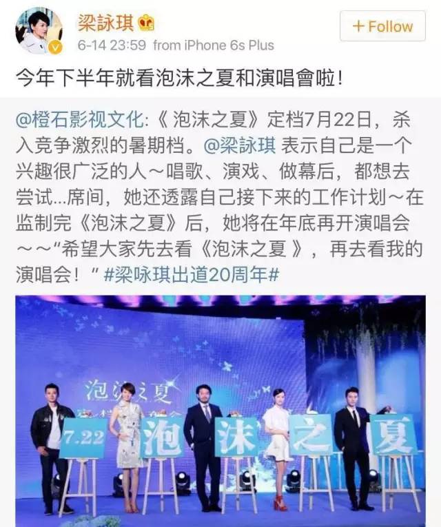 从年初开始就带着《泡沫之夏》众主创亮相各大红毯、召开发布会,从北京电影节到上海电影节,再到微博之夜,为电影造势不遗余力。