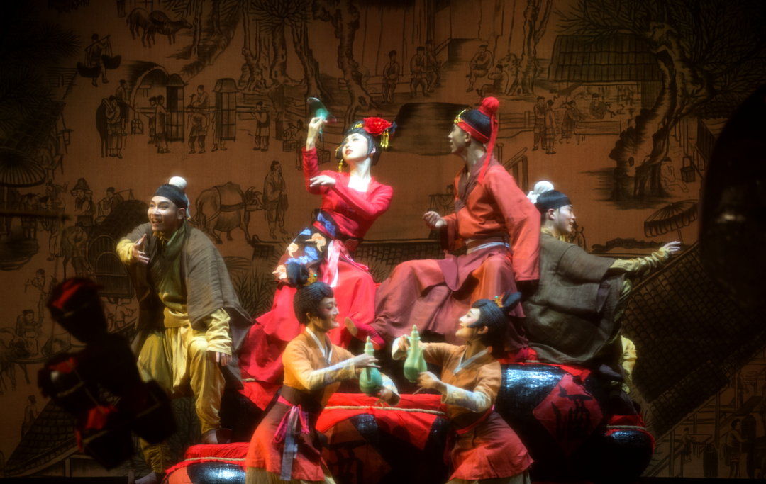 那段《酒旗阡陌》,演绎的就是张择端《清明上河图》中的景象。在表演时,舞台背景是清明上河图,舞者们则围坐在巨大的酒坛旁,摇晃着身体谈笑晏晏,柔若无骨的舞蹈动作间,仿佛真的饮醉了酒,令人沉醉。