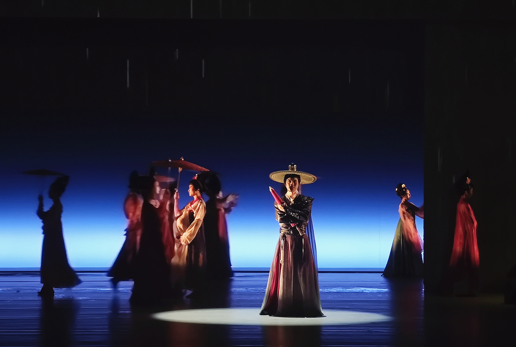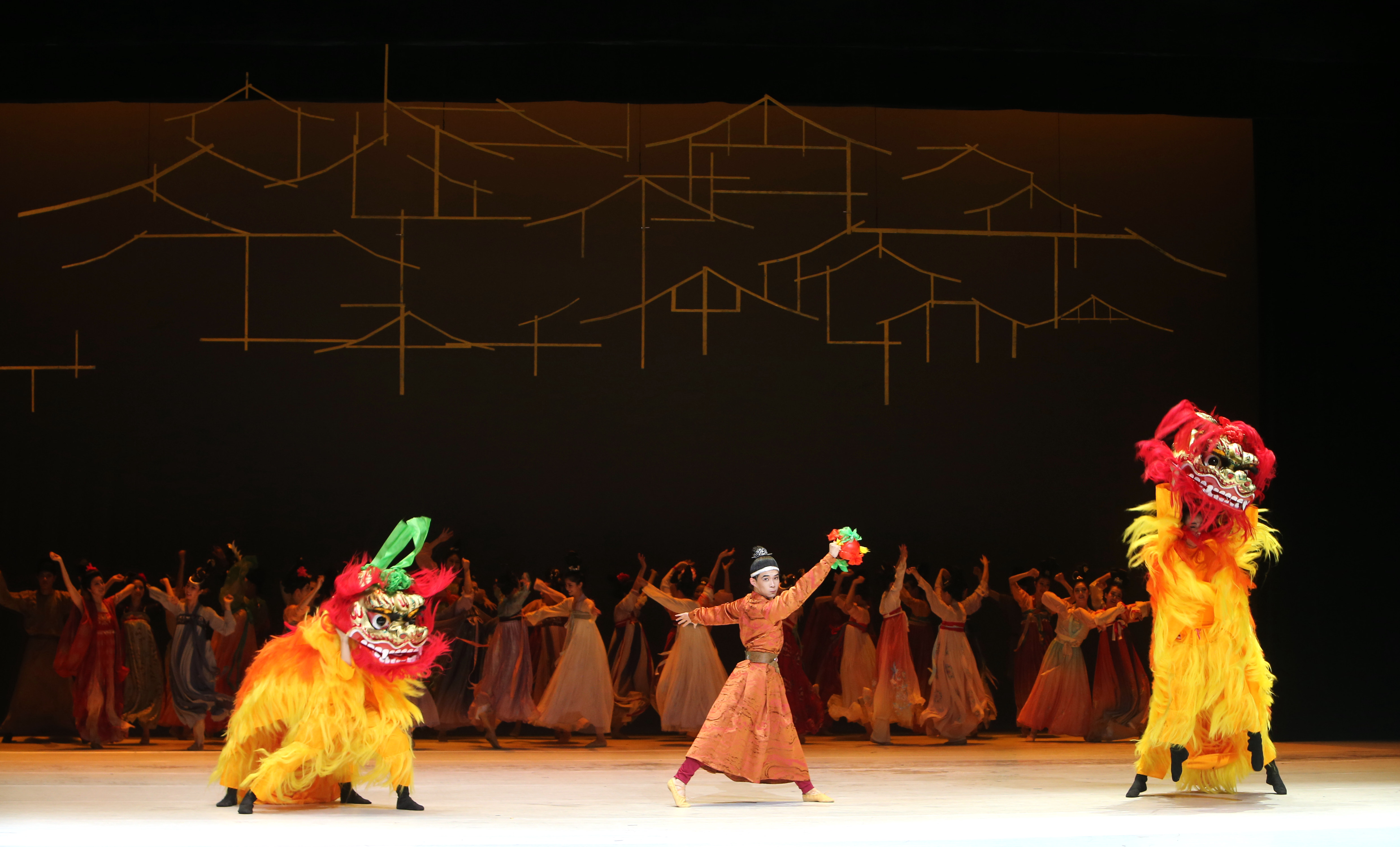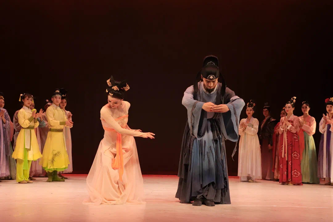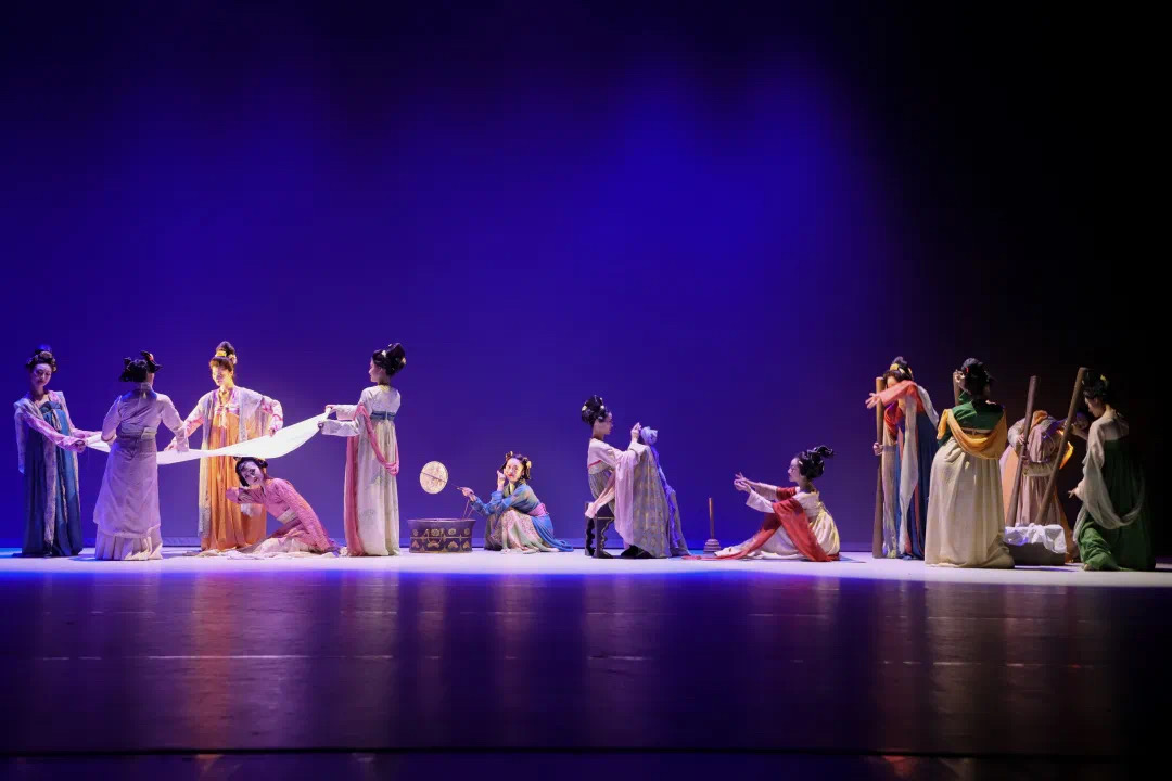 除此之外,在这场舞剧中,我们还将看到许多与唐朝民风息息相关的艺术元素。例如舞者们身上的短襦长裙披帛,就大幅度的还原了唐朝仕女的形象。在我国历史上,女子多以保守为主,但在思想开放的唐朝,女子服装得到解放,这彰显了唐朝的女子地位有所提升,表现了唐朝较为自由的民风。