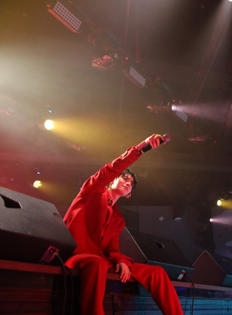 之后,他们为大家演唱了单曲《过敏》,燃炸的旋律在舞台上响起时,岳岳身着草绿色西装,从台上走出来,他身后的木子洋一袭红色西装,两人服装的颜色碰撞,在灯光的映射下,更加吸引眼球。