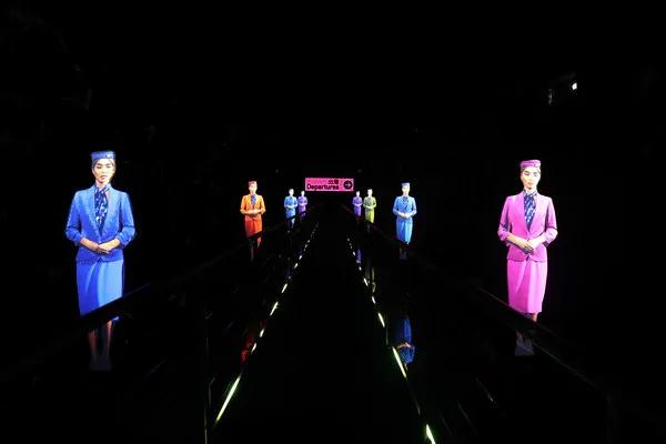 无限之门运用了灯光和虚拟技术,在波光粼粼的水潭中,为我们呈现了八位虚拟空姐,她们将引导游客走向装有无限镜和落地灯的候机厅;