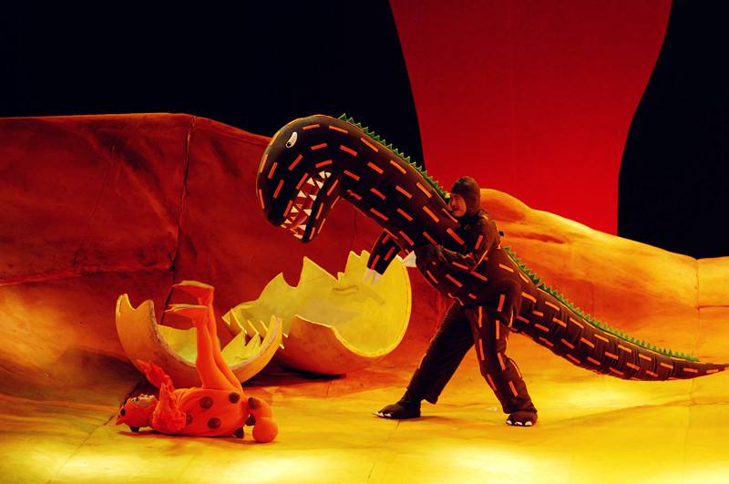除了强大的原著与音乐阵容,《你看起来好像很好吃》的舞台也充满了惊喜,处处暗藏玄机,不断制造出意想不到的神奇效果,将童话乐园一般的场景完美地呈现了出来:拉一下开关,月亮灭了;使劲跺一下脚,地上喷出气体来;红果子树倒着生长从天而降;太阳从蛋壳里孵出来;天上下起雨,掉下的雨滴却是蓝色的光斑。演出现场中的恐龙还会与台下观众互动,与孩子们零距离接触。