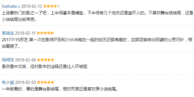 《无人生还》的故事发生在一座孤岛上,这样的故事本就最容易改编成话剧,据看过的观众收话剧版《无人生还》全场近三个小时的演出几乎无尿点,神秘、紧张、惊险、悬疑各种情绪翻涌着像海浪一样一阵阵袭来,让人身临其境,喘不过气。是为数不多改编非常成功的话剧。