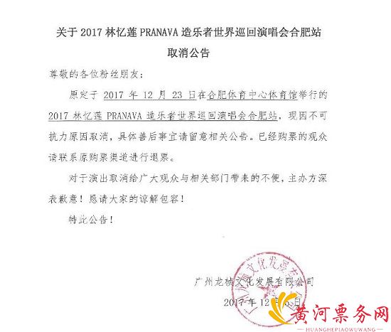 原定于2017年12月23日在合肥体育中心体育馆举办的,2017林忆莲PRANAVA 造乐者世界巡回演唱会ENCORE-合肥站,因不可抗因素取消,给大家造成的不便实在抱歉,具体善后事宜请联系客服,进行退票。