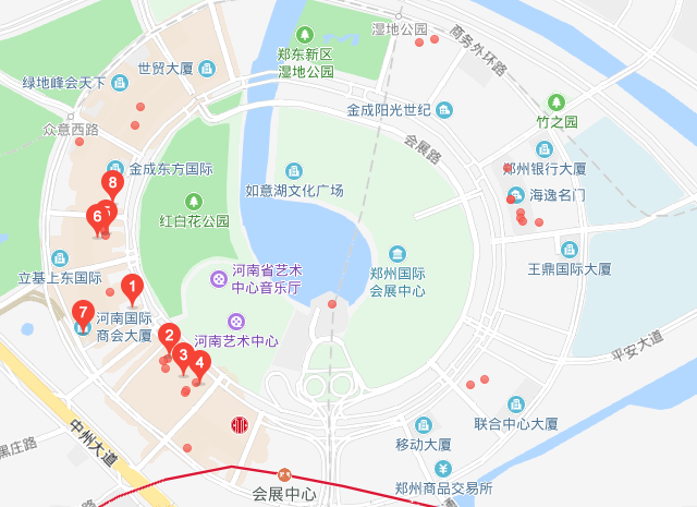 步行5分钟到达河南艺术中心。(标红点皆为酒店)