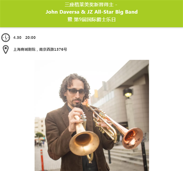 John Daversa(约翰·戴夫萨) ,2019年三座格莱美奖新晋得主,艺术家,作曲家,制作人,乐队指挥和教育家。John Daversa的音乐造诣让他成为了世界上许多著名音乐活动及节目的常客,诸如《奥普拉秀》、《今日秀》、蒙特利尔爵士音乐节、汉堡音乐节、爪哇爵士音乐节等。