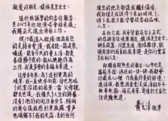 2018年9月底 费玉清以亲笔信的方式,宣布将于2019年巡 回演唱会结束后正式隐退,为45年来的演艺工作画 上句号。众粉丝纷纷表示心痛。本轮巡演将是费玉清最后一次站在舞台上献唱。