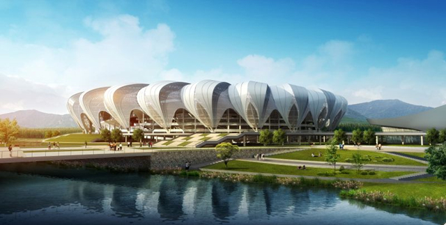 宜昌体育中心位于宜昌市体育场路,以已建体育场为中心,和初步形成的内环道路框架为交通纽带,布置各项建筑和设计景观。以叠加(网球馆和羽毛球馆、田径馆和停车库)和组合(体彩中心、游泳跳水馆、体育宾馆)的方式设计单体建筑,增加绿地面积和扩大停车场地。