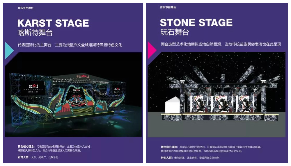 喀斯特舞台,代表国际化的舞台,展现兴文特色自然风光。玩石舞台,副舞台,展现当地传统的文化艺术。
