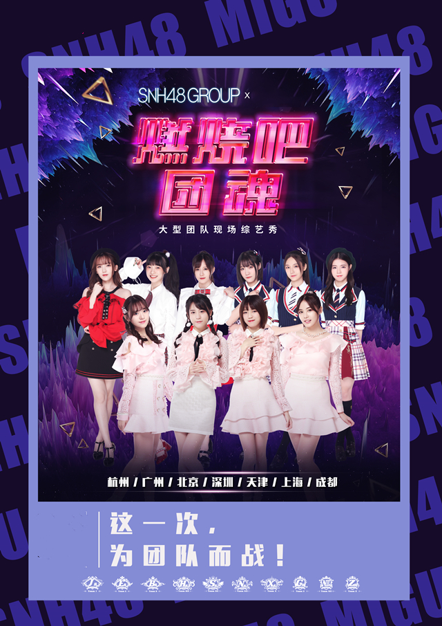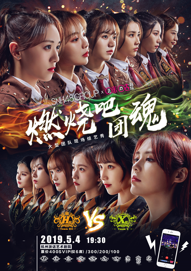 SNH48 GROUP X联合咪咕音乐打造的大型团队综艺《燃烧吧!团魂》首站即将在杭州举行了!来自SNH48的两支队伍TEAM HII和TEAM X将为我们表演精彩的节目,2019SNH48GROUP燃烧吧团魂杭州站,快和朋友来到现场收看这精彩的演出吧!