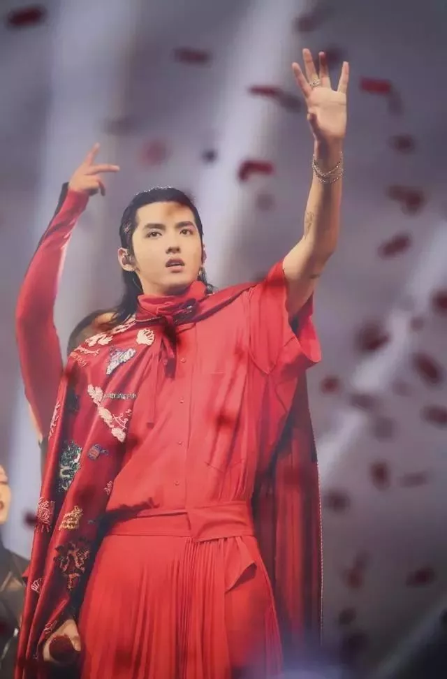 回顾刚刚结束的演唱会,吴亦凡的北京演唱会可谓是亮点不断,特别是吴亦凡的每一个造型都让人眼前一亮,墨绿绸缎提花睡衣款外套及同色长裤,黑色拼接软呢外套配同系列羽毛刺绣皮马甲,黄黑条纹西装及巴洛克印花衬衣等等,正常演唱会的搭配是十分吸睛,潮味十足,其中让人印象最为深刻就是他在唱《大碗宽面》时的一身正红色压褶裙裤,加上他半散的长发,简直就是“天神下凡”。
