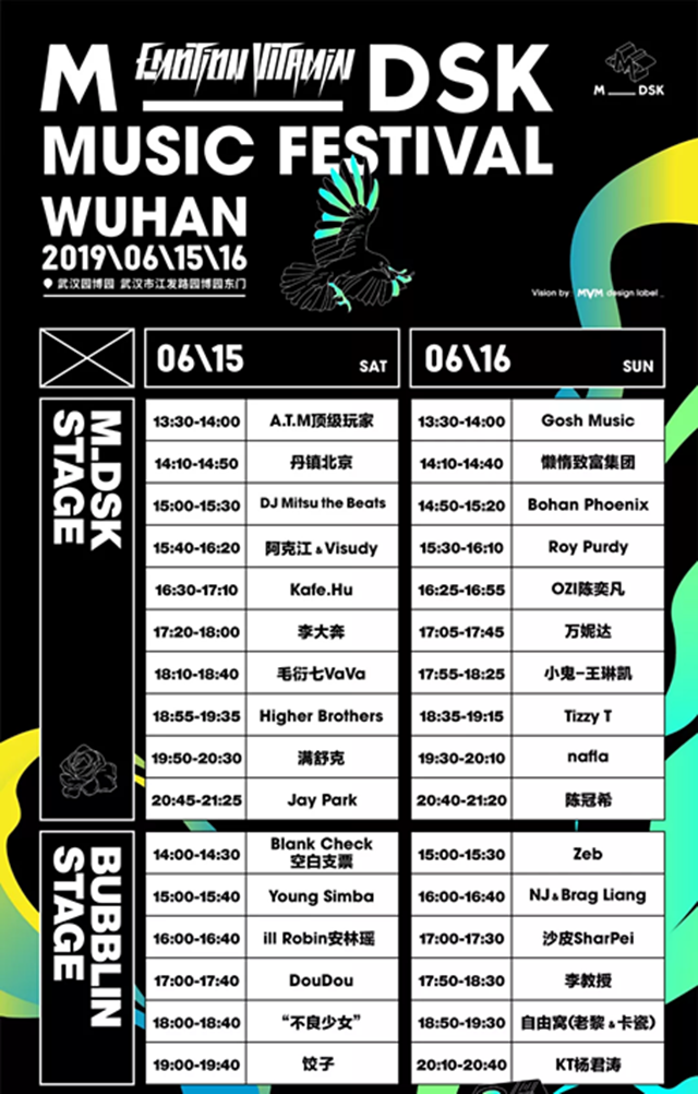 本次武汉M_DSK音乐节现场设立M_DSK SRAGE、BUBBLIN STAGE两个舞台,汇集32组来自海内外的音乐人及制作人,有成就不凡的国际知名艺人,势头凶猛的潮流ICON,女性Rapper佼佼者,展现Hip-Hop多元化的说唱团体,也有近两年涌现的新鲜面孔及武汉本土力量。