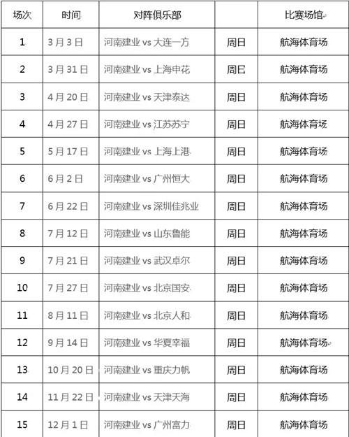 2019赛季中超联赛建业主场赛事时间表