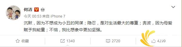 近日,陆续有娱乐八卦博主爆料,称何洁和赫子铭已经离婚,12月20日凌晨,何洁发微博:“沉默,因为不想成为小丑的同谋;隐忍,是对生活最大的尊重;奔波,因为母爱赋予我能量;不恼,我比想象中更加坚强。”随后,何洁经纪人转发此微博评论称“心疼”,更是引发网友猜测。