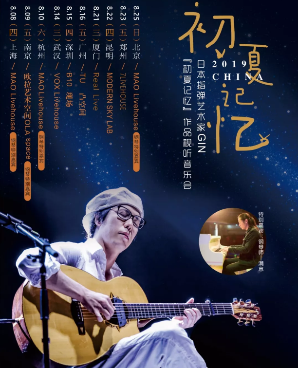 不但GIN本人的现场演绎,主办方还特别邀请了著名的钢琴演奏家满意先生,满意先生将与 GIN 共同演奏部分曲目。钢琴的浑厚与吉他的清亮,两者现场合奏会产生怎样的化学反应呢?两位演奏家都为了这次合作做了很多精心的编排,也加入了不少巧思,期待在这北京现场为大家展现非同凡响的视听体验。