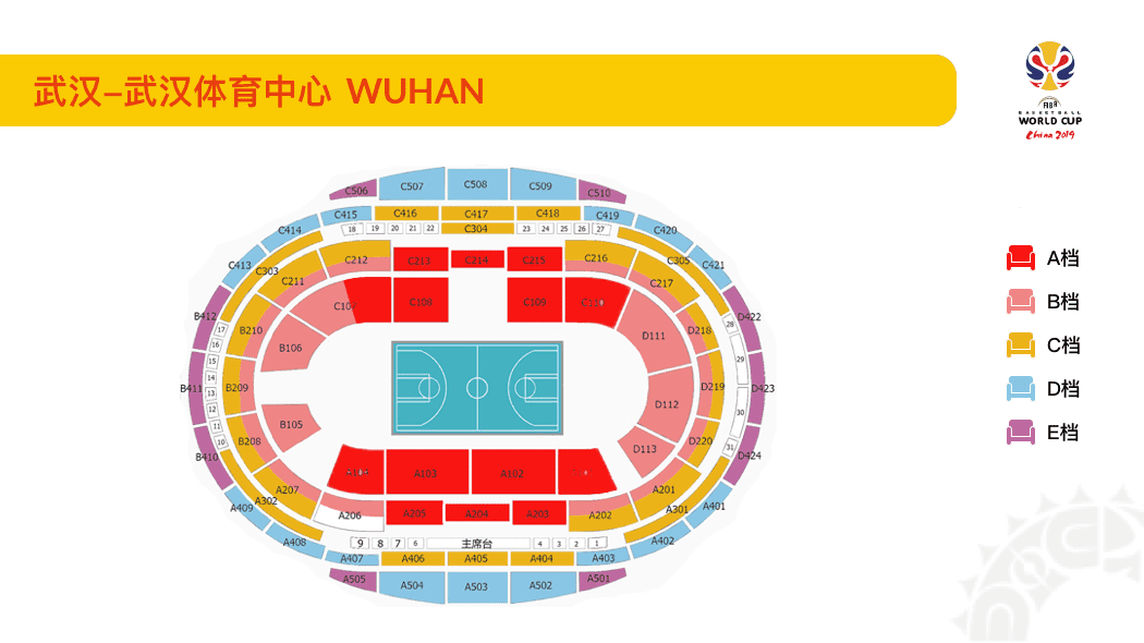 此次国际篮联世界杯所有场馆的门票将分为五个票档,从A(最贵)到E(最便宜),一些场地坐席也将根据实际情况出售。场馆图如下: