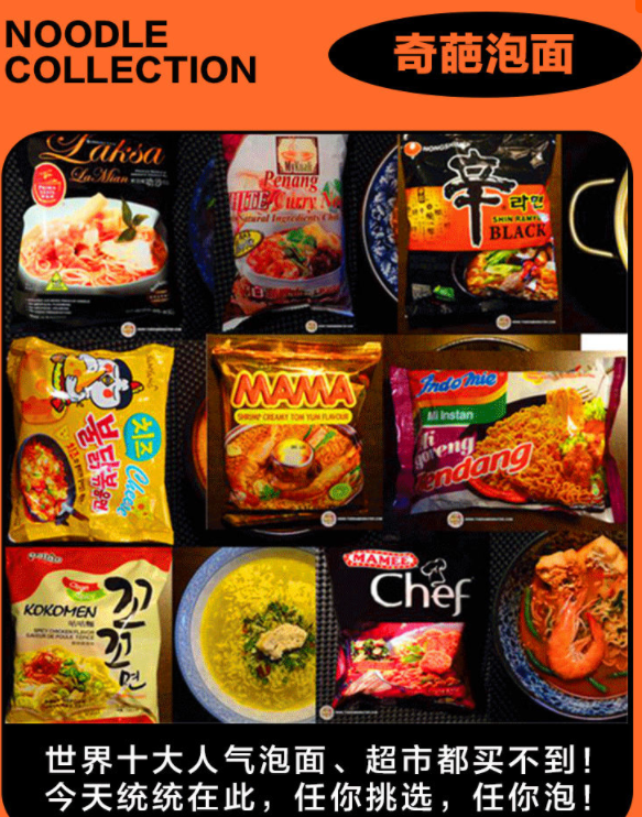 在这里,你从未见过的从未吃过的,从未能买到奇葩的泡面统统在这里,还有独家网红踩面池,5000+的举行泡面墙哟,任你吃,任你拍~