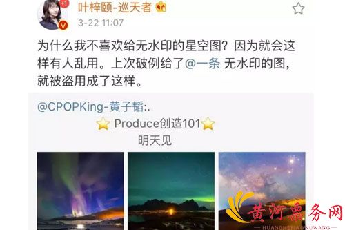 昨日中午,黄子韬在自己的微博Po出一组星空图片,用于宣传腾讯的新节目,而这组图片的创作者是摄影师叶梓颐,这位小姐姐看到自己辛苦拍摄的作品被他人莫名其妙的盗用了,心里也是很窝火的吧,于是就在微博上质问黄子韬,而韬韬在得知此消息的第一时间就跑到了小姐姐的微博下道歉,并将发布的图片注明版权。