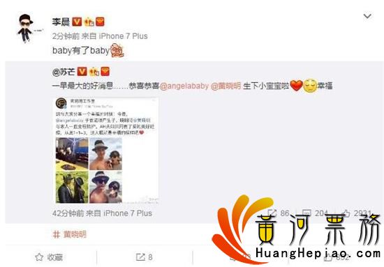 作为“跑男团”成员的李晨也送上了祝福,他说:“baby有了baby。”却被网友调侃:“大黑牛也抓紧啊!”“你呢,你呢,你呢,重要的事情说三遍!”黄奕祝福:“祝福晓明和baby,真好。”翟天临祝福:“恭喜黄爸爸黄妈妈!棒棒的阳光家族!”