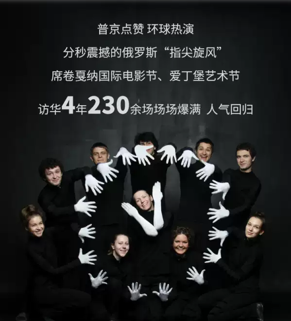 在这部剧的演出过程中,你不会看到任何的道具,但舞台上又会有所有场景的出现!十双手,凭空舞出一列呼啸而来的“创意过山车”,从第一分钟出格的创意就让你屏住呼吸,随后不停歇地变出几百个惟妙惟肖的形象一从环球风光到四季更替,从赛场风云到舞台经典...