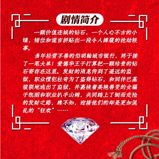 这部剧是改编自英国的剧本“银行大劫案”,全剧共有一个时辰的演出时间,描绘了一伙盗贼组团盗窃钻石的荒诞喜剧故事。最引人关注的还不是剧情本身,而是这部剧的男一号杜晓宇,相信很多朋友听到这个名字,就一定回来买票!