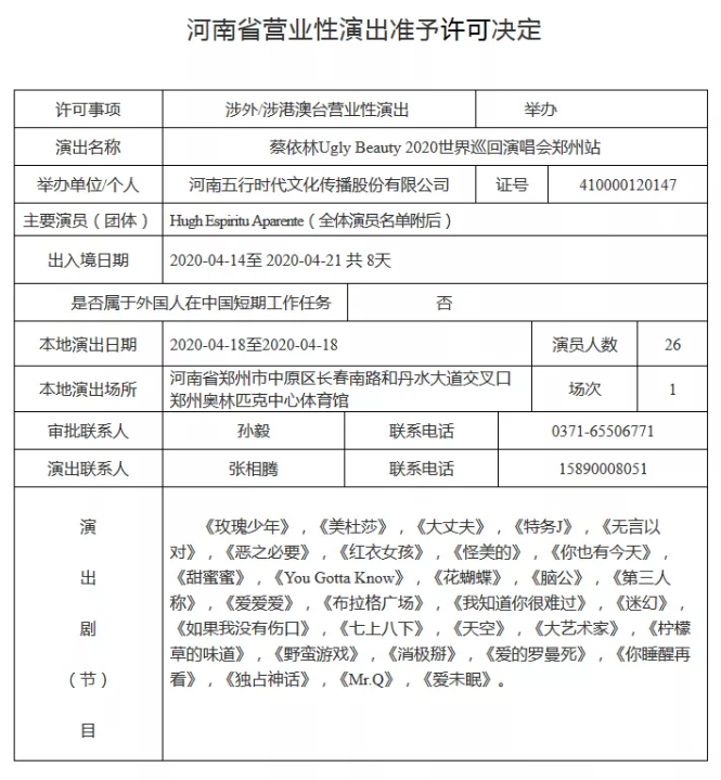 相比于前段时间台北以及深圳站开场秒罄的盛况,郑州站的朋友已经做好了准备,一定要打破前两站的记录!这次郑州站的审批文件上还有演出歌单的公布,大家可以感受一下!Jolin表示:「这次的演唱会希望尽力打破一切规则,带给大家疯狂的感官享受。」