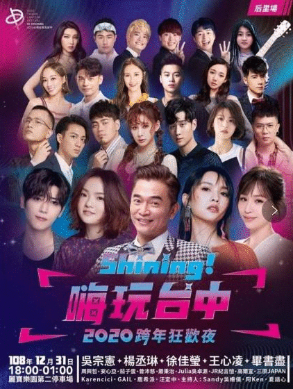 「Shining!嗨玩台中 2020跨年狂欢夜」迎来历届最强彩蛋卡司!这次晚会将扩大举办,连睽违两年没有接跨年场的「全能天后」杨丞琳都来了!还有压轴演出的徐佳莹、安心亚、曾沛慈等人。