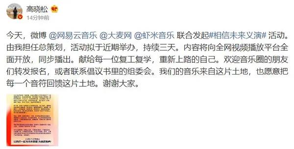 大概是接收到了众多乐迷的意念,著名音乐人高晓松,在昨日发了这么一条消息:“拟邀请上百位华语歌手,为中国各行各业的普通人歌唱,呼吁一起努力复工复产,积极乐观迎接疫情的最终消散。”