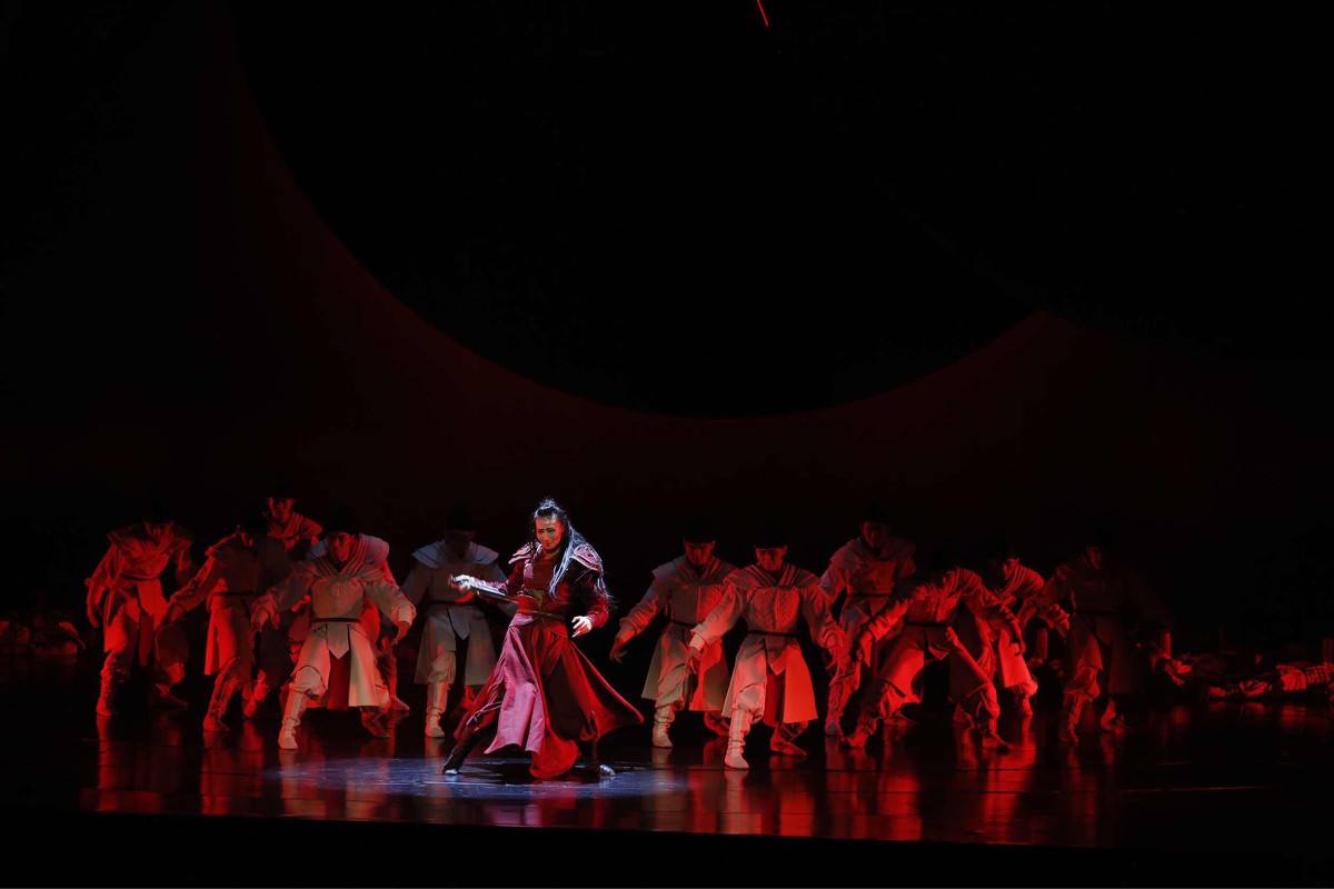 紧接着,战争开始,演员的舞姿变得遒劲有力,配合略显昏沉还不停晃动的舞台灯光和雄浑悲壮的音乐,扑面而来的血雨腥风与危机四伏,仿佛观众们正身处战场之中一般,而花木兰那英勇杀敌,报效国家的形象也更加生动形象。