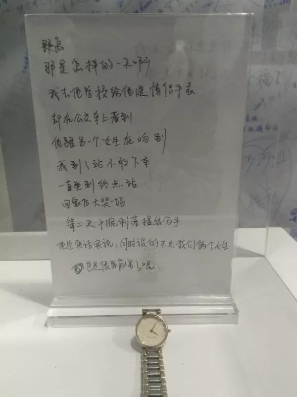 这是一间充满着故事和忧伤的长廊,左右两边排列着白色的展台,展台上搁置着失恋后的物品。这些物品可能是一个可爱的毛绒玩具,一条没有送出去的手表,还可能是一份触动人心的道别信。它们是爱情的纪念品,也是一段刻苦铭心的故事。