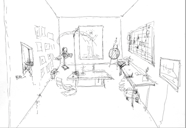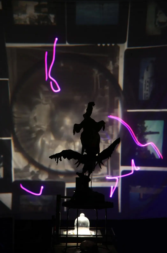 展览开始,童昆鸟将通过一台特殊的影像装置,向我阐述他的艺术想法。这个影像装置与一般装置不同,它利用老式幻灯机的底片成像原理与光影原理而成像的。