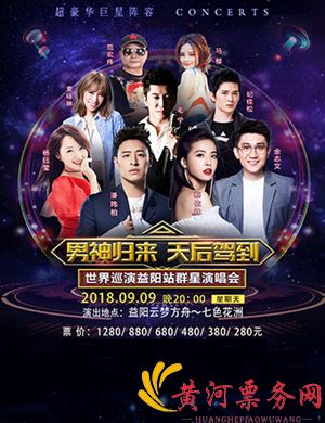 《男神归来·天后驾到》是中国知名的大型群星演唱会品牌,致力于为全国观众创制“票超所值、惊艳动听”的、以演唱会形式呈现的视听盛宴。2018男神归来·天后驾到益阳群星演唱会,蔡依林、潘玮柏、毛宁等等重量级歌手,男神天后,重磅云集,带给你无与伦比的视听享受。相聚益阳,到现在来为你心中的爱豆尖叫呐喊!