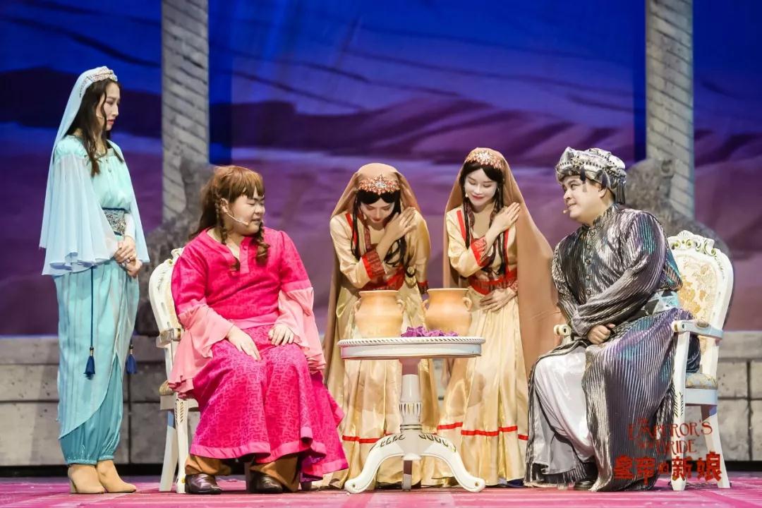 除此之外,《皇帝的新娘》的舞台布景和演出戏服,也都是这场话剧的亮点。气势恢弘的戏台还原了故事中的西域古国,舞台场景随着情节的变化一一转换,让剧情更加流畅。演员们身着充满异域风情的手工戏服,在恰到好处的配乐之中演绎着这个笑料十足的故事,让观众有了更好的观看体验。