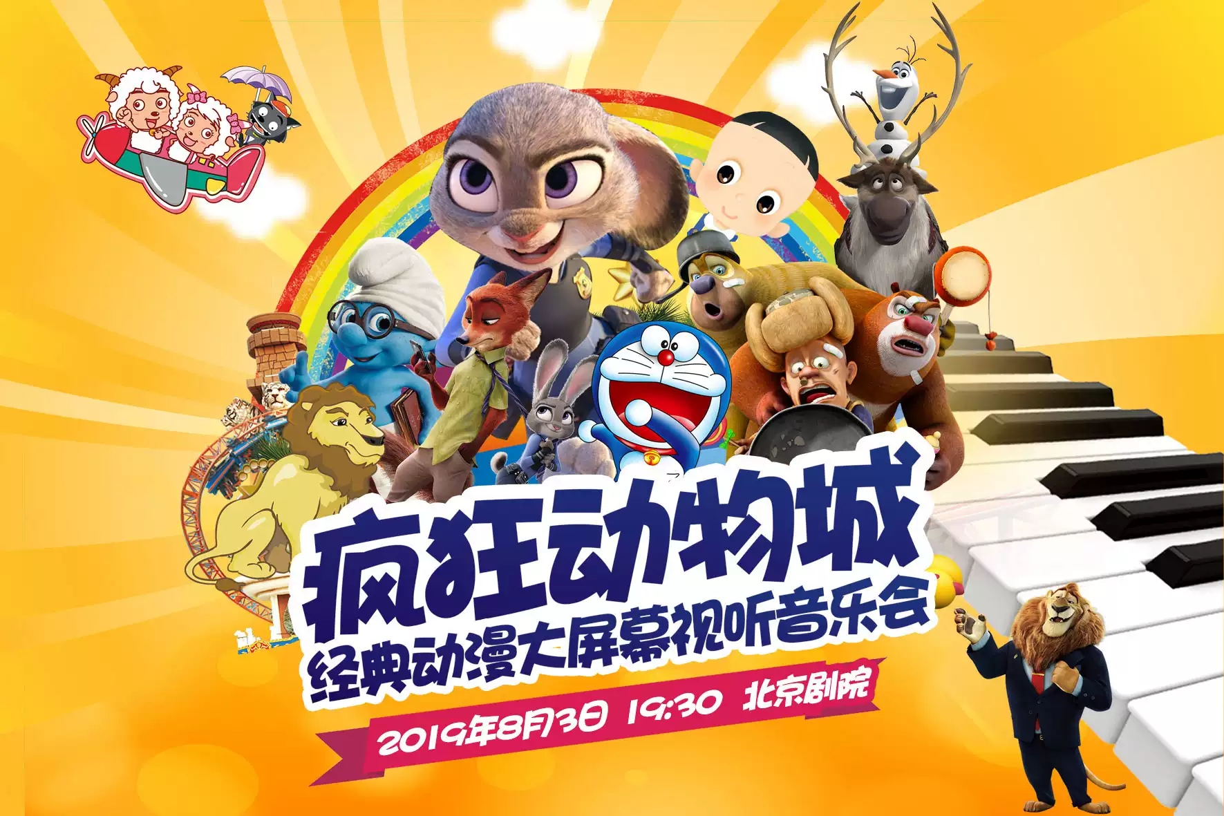 2019疯狂动物城—经典动漫大屏幕视听交响音乐会-北京站,将打造一场专属的童话视听盛宴,让粑麻和宝贝一起沉浸在童话里的世界,感受大屏幕生动的动漫画面,在那悠扬灵动的真情旋律下,带孩子一起开启一场音乐之旅!