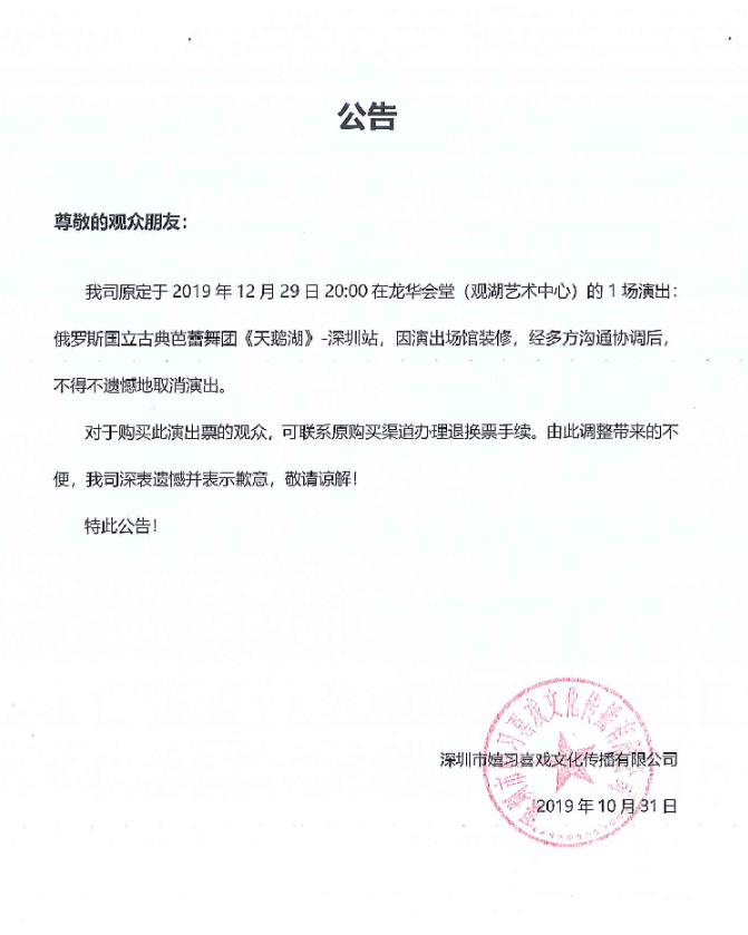 本次2019芭蕾舞剧天鹅湖深圳站,严禁携带易燃,易爆炸和管制刀具等危险物品。文明观看演出,遵守现场秩序、请勿翻越隔离设施,请勿站在座位,通道,走廊以及台阶上,以免出现危险。入场前请将手机关闭或调至静音状态。感谢您的支持!