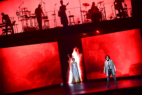 《摇滚红与黑》没有采用“大布景大装置”的实体制作方式,转而采用创新的舞台技术与多媒体创意,整个投影视频都以3D拍摄制作,别具艺术构思,悉心引导观剧体验,同时也使观众能够更为关注人物内心,更容易走进剧中人的喜怒哀乐。