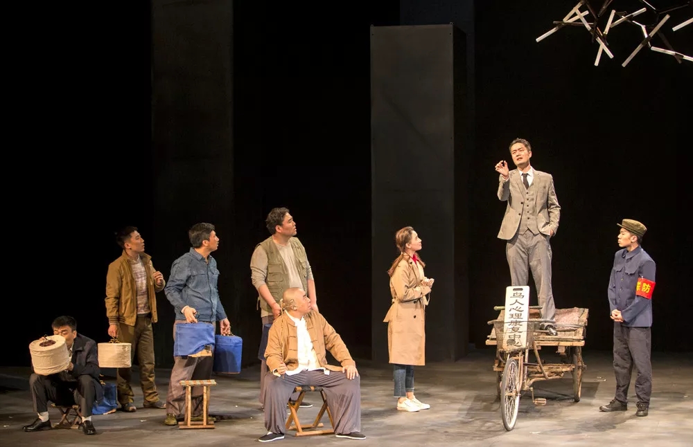 舞台上没有真实的树,没有石桌石凳,布景的设置模糊了年代感,简约的框架幕布,配合巧妙的灯光设计,更加写意,抽离现实的表现手法让整部剧更加具有荒诞性。一辆三轮车随着剧情的发展,是众鸟友中的"鸟市",珍贵的鸟笼都聚集在此,永远都是鸟人们关注的焦点;是三爷在"鸟人心理康复中心"的专属位置,躺在车上就是床位,与精神分析学家丁保罗展开对话;是断案时的公堂,鸟人们的来言去语引人深思……三轮车成为了一个移动的转台,承载着剧情的起承转合。