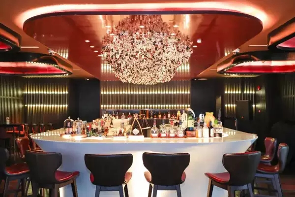 酒吧空间内,抬头便是满眼的水晶吊灯,