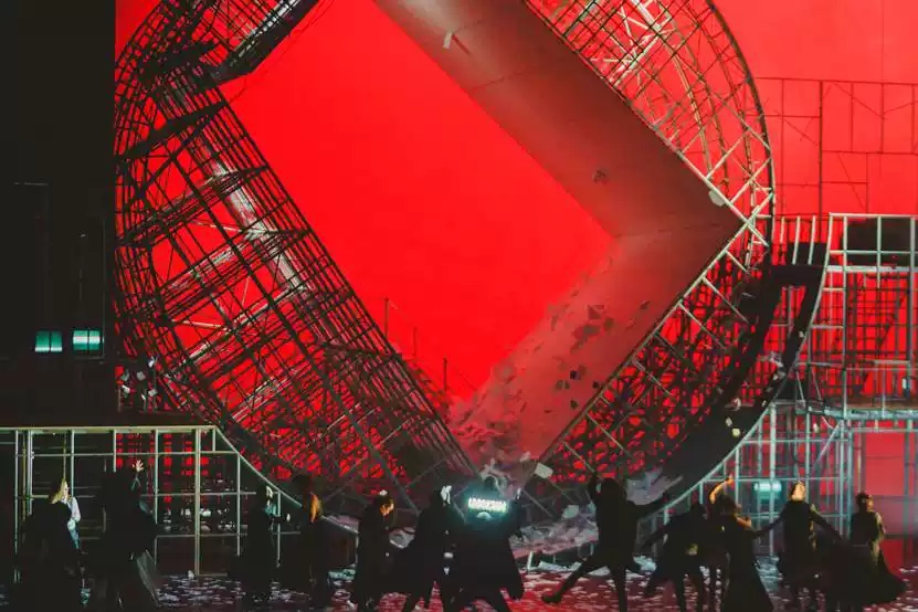 12000根钢管搭建起一个"机械剧场"。视觉艺术家张武,给《茶馆》送来了他创作生涯中单场最大的舞美作品。19米长、16米深、11米高的 "时间巨轮"。