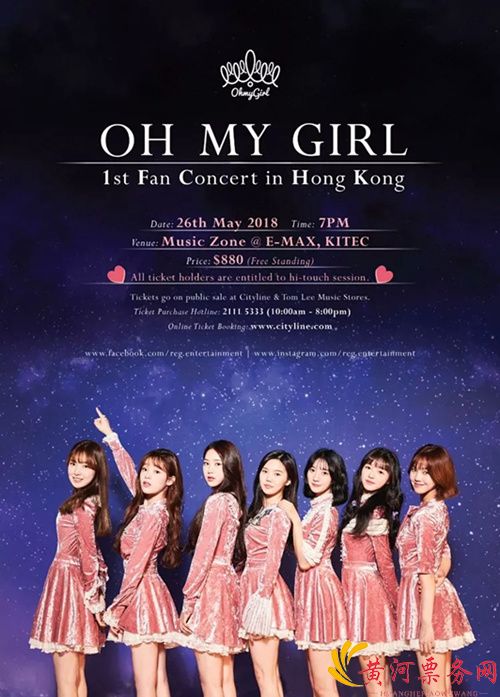 [香港,2018年3月20日] B1A4的师妹团 OH MY GIRL 即将于香港举行首个Fan Concert,与香港的Miracle (粉丝官方名称) 见面了。Rolemodel Entertainment Group (REG) 刚宣佈OH MY GIRL的首个香港演出 <OH MY GIRL 1st Fan Concert in Hong Kong> 将于 2018 年 5 月 26 日(星期六)在九龙湾国际展贸中心Music Zone @ E-Max举行。票价为港币880元,购买了门票的观众都能参与击掌会,与 OH MY GIRL 近距离接触。