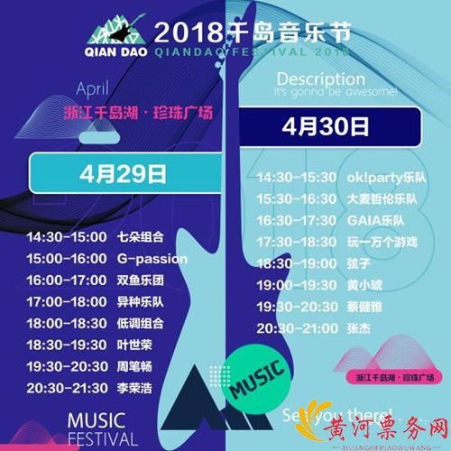 4月29日和4月30日两天,2018首届千岛音乐节将在千岛湖珍珠广场激情上演。首届千岛音乐节以五大主题街区的全新方式亮相(创意集市区、休闲美食区、主舞台音乐区、激情DJ秀区、即兴涂鸦区),届时有20支来自世界各地的乐队及歌手出现在舞台上,包括张杰、蔡健雅、周笔畅、李荣浩、弦子等人在内。每天的演出时间从14:00-22:00,给了乐迷更多的狂欢时间。