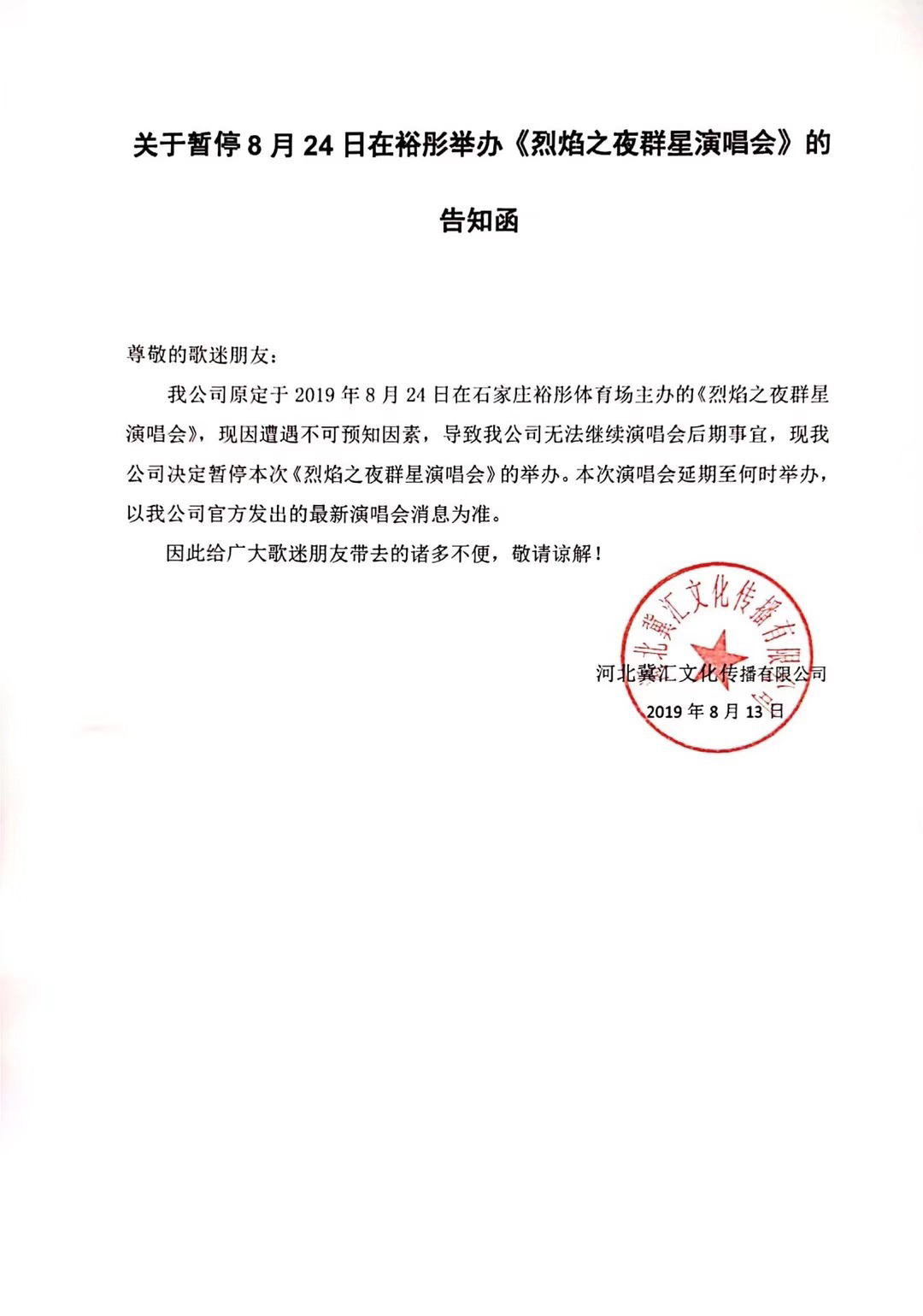 2019烈焰之夜石家庄群星演唱会,本场演唱会严禁携带易燃,易爆炸和管制刀具等危险物品,硬质饮料等入场。请准时入场,保持票券平整,配合安检人员检票,一人一票,对号入座。文明观看演出,遵守现场秩序、请勿在场馆内抽烟;请勿站在通道,走廊以及台阶上,以免出现危险。感谢您的支持!